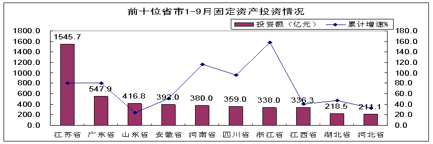 前三季度,东部10省市完成投资3825亿元,同比增长74.9%,增速高于去年同期26.3个百分点;江苏、广东、浙江、北京投资上升较快,增速均超过80%,特别是江苏省完成投资1546亿元,占全国总投资的近四分之一。中部6省完成投资1557亿元,同比增长60%,其中安徽、河南投资增长突出,分别居全国第四、五位,增长51.2%和116.4%。西部12省市完成投资836亿元,同比增长53.5%,其中四川省投资359亿元,占西部地区的43%,同比增长95.4%。东北三省完成投资274亿元,同比下降6.2%。
