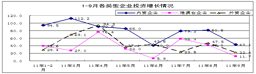 前三季度,内资企业完成投资4821亿元,占全行业的74%,同比增长72.9%,高于全行业10.5个百分点,其中私营企业增势突出,同比增长达107.4%。外商投资和港澳台企业分别完成投资961和710亿元,同比增长42.1%和33.7%,低于全行业20.3和28.7个百分点,其中9月份分别增长22.4%和11.7%。