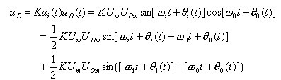 式中的ω0为压控振荡器在输入控制电压为零或为直流电压时的振荡角频率,称为电路的固有振荡角频率。则模拟乘法器的输出电压uD为: