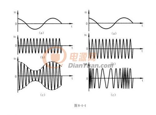 调幅波的特点是频率与载波信号的频率相等,幅度随输入信号幅度的变化而变化;调频波的特点是幅度与载波信号的幅度相等,频率随输入信号幅度的变化而变化;调相波的特点是幅度与载波信号的幅度相等,相位随输入信号幅度的变化而变化。调幅波和调频波的示意图如图8-4-4所示。