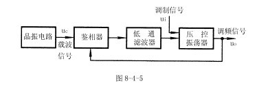 调频波的特点是频率随调制信号幅度的变化而变化。由8-4-6式可知,压控振荡器的振荡频率取决于输入电压的幅度。当载波信号的频率与锁相环的固有振荡频率ω0相等时,压控振荡器输出信号的频率将保持ω0不变。若压控振荡器的输入信号除了有锁相环低通滤波器输出的信号uc外,还有调制信号ui,则压控振荡器输出信号的频率就是以ω0为中心,随调制信号幅度的变化而变化的调频波信号。由此可得调频电路可利用锁相环来组成,由锁相环组成的调频电路组成框图如图8-4-5所示。