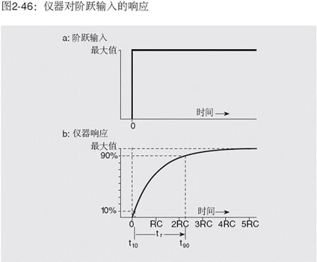 模拟仪器(或模拟输出)的上升时间一般定义为输入信号从零立即上升到某一固定值时,输出信号从最终值的10%上升到90%所需要的时间。此关系示于图2-46。图2-46a示出假定上升时间为零的阶跃函数,而图2-46b示出仪器的响应及相应的上升时间。单极点系统(1阶系统)的上升时间、频率响应和RC常数是有关联的。3dB点由下式给出: