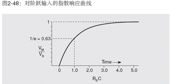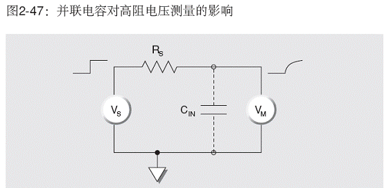 在对高阻抗源进行电压测量时(图2-47),电压表(VM)两端的电容(CIN)必须通过RS充电。输出电压对时间的函数关系为: