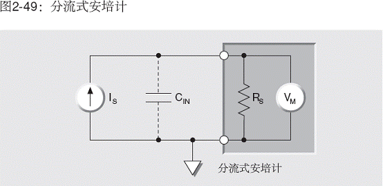使用分流型安培计(图2-49)时,输入电容对电流测量的影响与电压测量时类似。分流型安培计可以看成是在其输入端跨接了电阻器的电压表。电路表明,输入电容(CIN)必须以时间常数RSCIN的指数速率,充电到ISRS伏。注意,CIN是源、连接电缆和仪表电容之和。