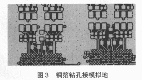 (5 )大面积覆铜箔接模拟地。在模拟电路部分覆大面积铜箔并在空白区域钻密集的孔接到模拟地,这样可以起到屏蔽隔离作用,从而减少模拟信号之间的相互干扰,而且还可以起到散热作用。