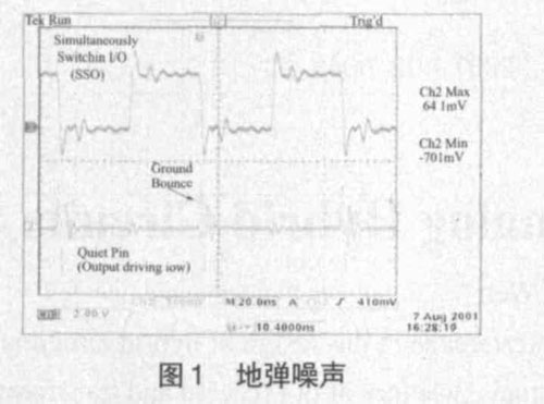 模拟信号与数字信号相比,对噪声的敏感程度要大得多,因为模拟电路的工作依赖连续变化的电流和电压,任何微小的干扰都能影响它的正常工作,而数字电路的工作依赖在接收端根据预先定义的电压电平或门限对高电平或低电平的检测,具有一定的抗干扰能力。但在混合信号环境中,数字信号相对模拟信号而言是一种噪声源。数字电路工作时,稳定的有效电压只有高低电平两种电压。当数字逻辑输出由高电压变为低电压,该器件的接地管脚就会放电,产生开关电流,这就是电路的开关动作。数字电路的速度越快,其开关时间一般也要求越短,当大量的开关电路同时由逻辑高电平变为逻辑低电平时,由于地线通过电流的能力不够,大量的开关电流就会引起逻辑地电压发生波动,我们称为地弹。如图1 所示。数字电路造成的地弹噪声和电源扰动,如果耦合到模拟电路中,就会影响模拟电路的工作性能。由于相当多的干扰源是通过电源和地总线产生的,其中地线引起的噪声干扰最大,所以在PCB 设计时对地和电源的设计就显得尤为重要。