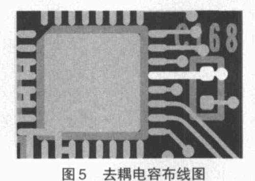 (4 )添加去耦电容。去耦电容可以消除高频干扰,由于电容器的容抗与频率成反比,因此将电容并联在信号与地线之间就起到对高频噪声的旁路作用。原则上将每个集成芯片都加上一个0.01mF~ 0.1mF 的陶瓷片电容,不仅能使芯片存储能量,提供和吸收该芯片的电路开门和关门瞬间的充放电能,还能旁路过滤掉该器件的高频噪声成分。在电源输入端加上一个10mF~100mF 的电解电容(最好是钽电容),可以抑制电源的噪声干扰,当然加入的电容引线不能太长,因为电容的引线长度是一个十分重要的参数,引线越长,则感应电感越大,电容的谐振频率就越低,对高频噪声的频率过滤作用就会减弱,甚至消失,因此在高速PCB 板设计时,要特别注意使电容器的引线尽量短,也就是使得电容尽可能地靠近芯片。
