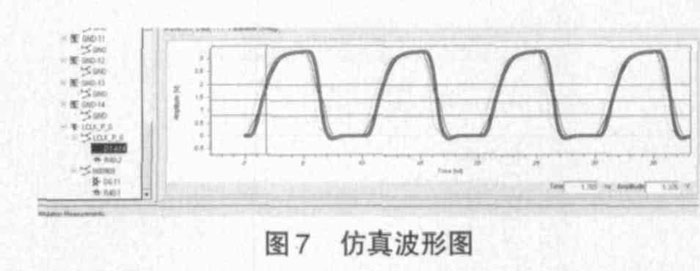 此印制板上100M 的时钟信号线经过设计软件仿真分析,如图7 所示,信号传输基本没有受到干扰,达到电讯要求。生产的印制板经过调试显示,数字信号对模拟信号的干扰很小,参数指标良好。