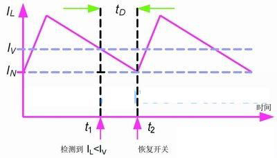 一般而言,通常采用比较器来检测IL是否超出IV,以决定关断或重新开通??墒?比较器会带来延时tD,影响阈值的有效值。如图2所示,比较器在t1时刻检测到IL< p> V,可是偶遇延时tD,开关会在t2时刻被恢复?;谡飧鲈?有效阀值IN便会低于IV,这样,实际的输出IOUT(CL)为: