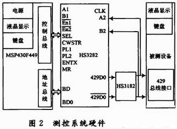 接口的实现方式选用Intersil公司的HS3282芯片,它支持ARINC429通信规范和其他串行数据传输协议,采用+5 V供电。具有两路接收、一路发送的功能。通道接收器之间也是独立的并行接收,可以直接连接到ARINC429总线,而不需电平转换。使用时和HS3182总线驱动器配合,就可以发送数据进行二级差分驱动,产生ARINC429总线的电平。HS3282数据总线为16位,MSP430F449为16位单片机,从而避免了8位单片机为解决系统总线匹配的问题需要采用锁存器作为虚拟总线的烦恼,提高了测控系统的可靠性。