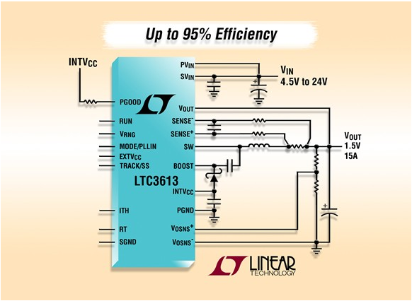 凌力尔特公司 (Linear Technology Corporation) 推出高频、接通时间受控的同步降压型 DC/DC 转换器 LTC3613,该器件具差分输出电压采样和时钟同步。受控的接通时间和谷值电流模式架构在瞬态事件时可通过提高工作频率以实现非常快速的瞬态响应,从而允许 LTC3613 仅在几个时钟周期内就可从大的负载步进中恢复。其 4.5V 至 24V 的输入范围支持多种应用,其中包括大多数中间总线电压。集成的 N 沟道 MOSFET 可在 0.6V 至 5.5V 的输出电压范围内提供高达 15A 的连续负载电流,从而使该器件非常适用于负载点应用。