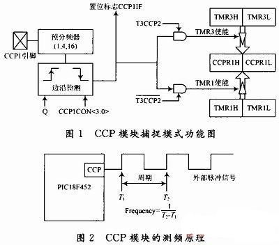 使用PIC18F452进行频率测量的原理如图2所示:设置CCP??楣ぷ饔诓蹲侥J剑⑶胰盟诿扛錾仙夭蹲揭淮问?,由相邻两个上升沿到来的时间差就可以得到被测脉冲的周期,从而也就得到了脉冲的频率。