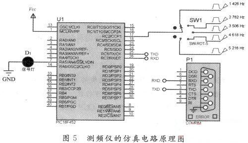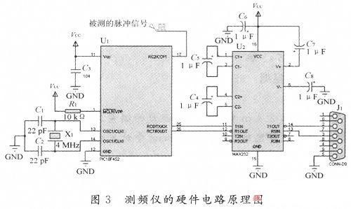 测频仪的硬件电路主要包括两个方面:频率测量电路和数据通信电路。频率测量是指使用PIC18F452的CCP??椴饬客獠柯龀逍藕诺钠德?;数据通信是指将测量得到的数据通过串口传至PC机进行处理。测频仪的硬件电路如图3所示。