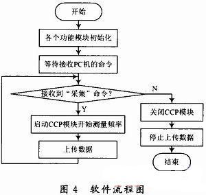 软件的主要功能就是设置相关的功能??槔磁浜嫌布迪制德实牟杉胧莸纳洗?,为了达到实时采集的目的,CCP??槭褂弥卸戏绞浇胁蹲健2馄狄怯隤C机采用主从式通信,PIC18F452根据PC机发来的不同指令进行相关的操作,指令共有两种:开始采集和停止采集。当接收到“开始采集”命令时,PIC18F452就启动CCP??榻衅德实牟饬坎巡饬拷峁ü谏洗絇C机;当接收到“停止采集”的命令时,PIC18F452就关闭CCP??椋蓖V股洗?,然后继续等待上位机的命令。测频仪的软件流程图如图4所示。