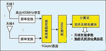VIPER被设计成在最少的RF硬件条件下,在软件中实现处理功能。图4给出了接收器硬件的模块示意图。执行单阶下变频后,在四个信道的每一个信道的IF信号以每秒1G的采样率被采样。所采集样本信号存储在RAM中,并由计算机处理。