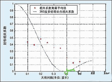 图5:在市区、非LOS环境下,空间分集测量中封包(envelope)相关系数与天线间隔关系