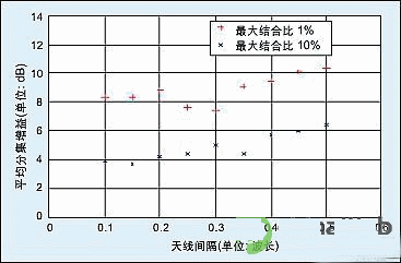 图6:在市区、非LOS环境下,空间分集测量中平均分集增益与天线间隔关系图
