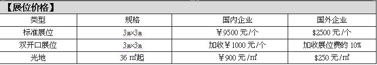 标准展位配备三面围板(高2.5m)、公司楣板、咨询台1张、椅子两把、光管2只、电源插座1个、废纸篓1个;光地不提供任何配置;展位搭建、用电、展具需另行租赁。