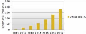 虽然最近两年由于超薄笔电高售价与超薄显示器供应限制等因素,市场将无法快速增长;但是未来作为新型计算机产品,超薄笔电更时尚的设计、实时启动和电池待机时间长等特性,有望于在预测后期拉动市场需求。到2017年,笔记型计算机预计将出货4亿3千2百万台。