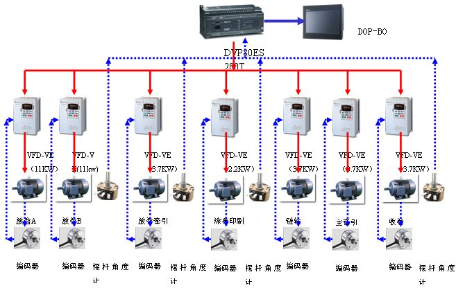 系统中所有变频传动轴均采用了编码器反馈的闭环的矢量控制模式,之所以使用闭环矢量控制模式,是为了保证传动轴的速度控制精度能够更准确、更快速、更稳定,尽量避免电机的滑差所造成的不同速度的线速度线形关系。