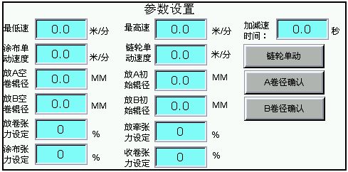 主画面反映了全部传动轴的运行状态、当前放卷卷径、线速度,以及各个摆杆的张力角度位置等,如图3所示。参数设置界面提供了一些工艺参数数据等,如图4所示。