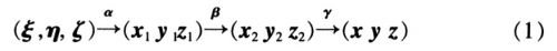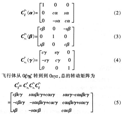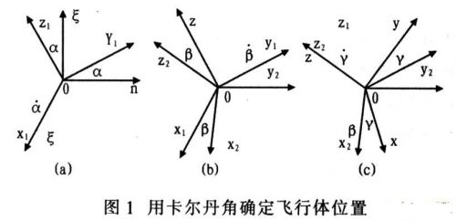 在对刚体的转动运动进行解析描述时.常应用欧拉角或卡尔丹角??ǘそ鞘视糜谧颂潜浠闲〉某『希虼耍每ǘそ墙忻枋?。取初始时刻飞行体坐标系Oξηζ为固定坐标系,0xyz为与飞行体固结的动坐标系??ǘそ茄∪〉姆椒ㄊ牵紫热?xi;轴转过α角,到达0x1y1zl的位置;再绕y1轴转动β角,到达0x2y2z2的位置;再绕z2轴转动γ角,到达0xyz的位置。转动关系如图l所示。