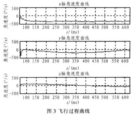 存储测试系统已经成功应用于某小型飞行体的试验,成功获得了测试数据。下面是实测曲线及其分析,x轴为自转轴,z轴为飞行方向。实测飞行过程角速度信号如图3所示,图3中,3个轴的角速度曲线在70 ms处均有一个小鼓包,为陀螺的加速度效应在曲线上的表现。