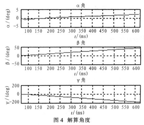 陀螺仪测得的ωx、ωy以及ωz已知,根据表达式7所示的运动学微分方程,在MATLAB下解算出角度,如图4所示。经对比,与高速摄影记录的姿态非常吻合。