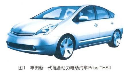 以作为混合动力电动汽车研发前沿的丰田汽车公司为例,所开发的混合动力电动汽车已达到实用化水平,自1997年所推出的世界上第一款批量生产的混合动力电动汽车Prius开始,其后又在2002年推出了混合动力面包车,该车混合动力系统采用了世纪首次批量生产的电动四轮驱动及四轮驱动力/制动力综合控制系统。2003年,丰田又推出了新一代Prius,也被称为“新时代丰田混合动力系统——THS Ⅱ”(见图1),节能效果可达到100km油耗不足3L。从2004年开始,丰田公司向欧洲市场推出了一款新的Lexus RX型豪华混合动力轿车。丰田公司计划2012年全部采用汽油电力混合发动机,以提高燃油经济性和降低排放污染。