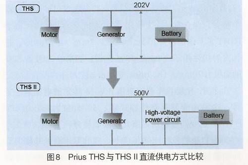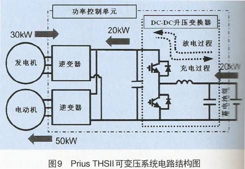 在THS中,蓄电池通过逆变器直接与电机和发电机相连(见图8);而THSⅡ中,蓄电池组输出的电压首先通过DC—DC升压变换器进行升压操作,然后再与逆变器相连,因此逆变器的直流母线电压从原THS的220V提升为现在的500V。