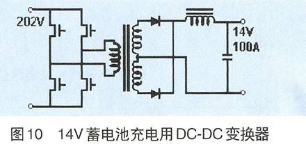 通常汽车中各种用电设备由14V蓄电池组供电(额定电压为12V),Prius也选用了14V蓄电池组作为诸如控制计算机、车灯、制动器等车载电气设备的供电电源,而对该蓄电池的充电工作则由直流220V通过DC—DC降压变换器来完成的,变换器的电路图如图10所示。变换器的容量为 1.4kW(100A/14V),功率器件选用压控型商用MOSFET(500V/20A),每个MOSFET芯片的面积为49mm2(7mm× 7mm)。