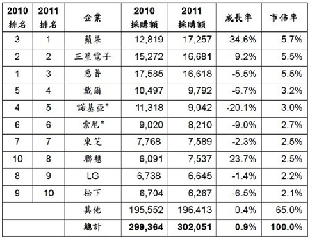 Gartner指出,苹果在智慧型手机市场的市占率提升,平板媒体在2011年亦有亮眼业绩。虽然2011年DRAM价格急遽下滑,许多PC业者紧缩整体半导体的需求,但随着MacBookAir的成功,使苹果PC事业对半导体晶片的需求增加。