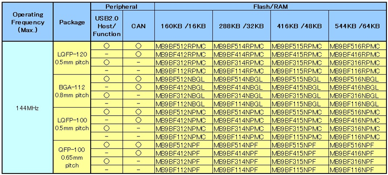 高性能产品组:MB9B510R/410/310/100 系列 (64款产品)