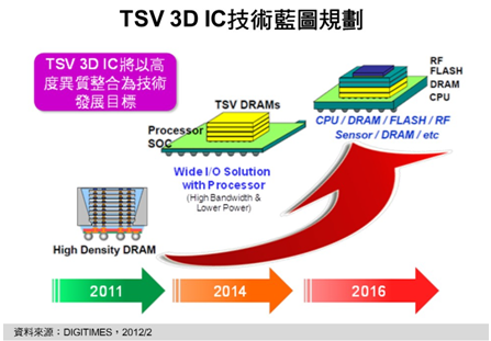 综合各主要芯片制造商技术蓝图规画,2011年TSV 3D IC是以同质整合的高容量DRAM产品为主,至2014年,除将以多颗DRAM堆栈外,尚会整合一颗中央处理器或应用处理器的异质整合产品。柴焕欣也预估,要至2016年,才有机会达到将DRAM、RF、NAND Flash、CPU等各种不同的半导体组件以TSV 3D IC技术整合于同1颗IC之中异质整合水平。