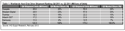 表1:2011年第四季度及第三季度全球硬盘出货量排名情况(出货量以百万计)
