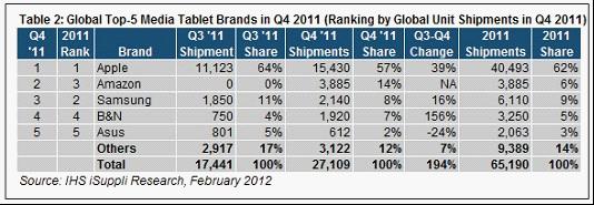 截止到年底,媒体平板电脑出货量为6520万个,略高于IHS公司预测的6470万个。