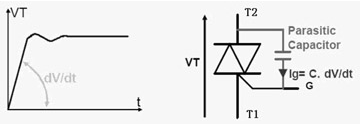 电压上升率的抵制:dv/dt指的是在关断状态下电压的上升斜率,这是防止误触发的一个关键参数。此值超限将可能导致可控硅出现误导通的现象。由于可控硅的制造工艺决定了A2与G之间会存在寄生电容,如图2所示。我们知道dv/dt的变化在电容的两端会出现等效电流,这个电流就会成为Ig,也就是出现了触发电流,导致误触发。