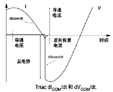 切换电压上升率dVCOM/dt。驱动高电抗性的负载时,负载电压和电流的波形间通常发生实质性的相位移动。当负载电流过零时双向可控硅发生切换,由于相位差电压并不为零。这时双向可控硅须立即阻断该电压。产生的切换电压上升率(dVCOM/dt)若超过允许值,会迫使双向可控硅回复导通状态,因为载流子没有充分的时间自结上撤出,如图3所示。[page]
