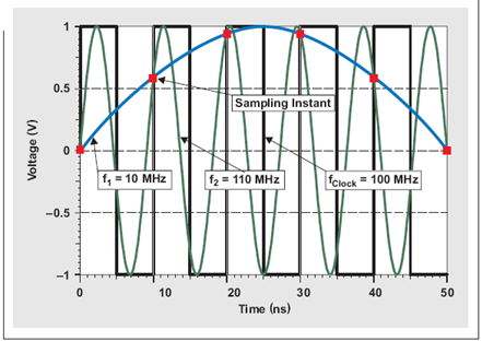 图 1 100MSPS 采样的两个输入信号显示了混叠带来的相同采样点