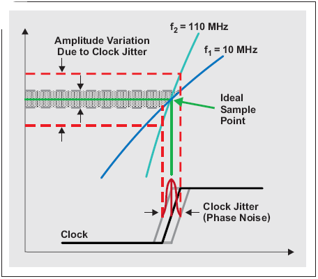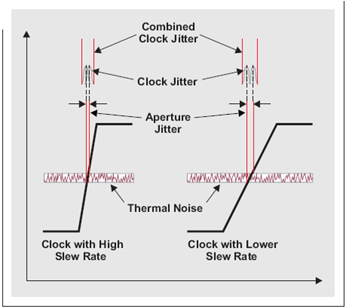 我们在产品说明书中可以找到 ADC 的孔径口抖动 (aperture jitter)。这一值一般与时钟振幅或转换速率一起指定,记住这一点很重要。低时钟振幅带来低转换速率,从而增加窗口抖动。