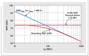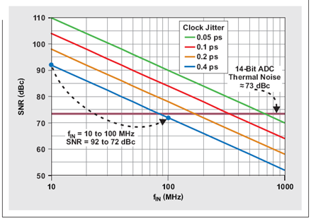让我们来对一个具有 400 fs 抖动时钟电路和 ~73 dB 热噪声的 14 位 ADC 进行分析。低输入频率(例如:10MHz 等)下,该 ADC 的 SNR 主要由其热噪声定义。由于输入频率增加,400-fs 时钟抖动越来越占据主导,直到 ~300 MHz 时完全接管。尽管相比 10MHz 的 SNR,100MHz 输入频率下时钟抖动带来的 SNR 每十倍频降低 20dB,但是总 SNR 仅降低 ~3.5 dB(降至 69.5dB),因为存在 73-dB 热噪声(请参见图 5):