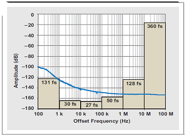时钟链(振荡器、时钟缓冲器或 PLL)中器件的输出抖动一般规定在某个频率范围内,该频率通常偏离于基本时钟频率 10 kHz 到 20 MHz(单位也可以是微微秒或者绘制成相位噪声图),可以将其整合到一起获取抖动信息。但是,低端的 10kHz 和高端的 20MHz 有时并非正确的使用边界,因为它们调试依赖于其他系统参数,我们将在后面进行详细介绍。图 6 描述了设置正确整合限制的重要性,图中的相位噪声图以其每十倍频抖动内容覆盖。我们可以看到,如果将下限设定为 100-Hz 或 10kHz 偏移,则产生的抖动便极为不同。同样地,例如,设置上整合限制为 10 或 20MHz,可得到相比 100MHz 设置极为不同的结果。