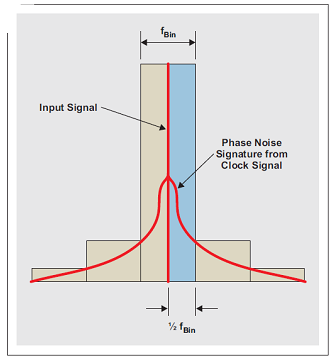 在采样过程中,输入信号与采样时钟信号混频在一起,包括其相位噪声。当进行输入信号 FFT 分析时,主 FFT 容器 (bin) 集中于输入信号。采样信号周围的相位噪声(来自时钟或输入信号)决定了邻近主容器的一些容器的振幅,如图 7 所示。因此,小于 1/2 容器尺寸的偏频的所有相位噪声都集中于输入信号容器中,且未增加噪声。因此,相位噪声整合带宽下限应设定为 1/2 FFT 容器尺寸。 FFT 容器尺寸计算方法如下: