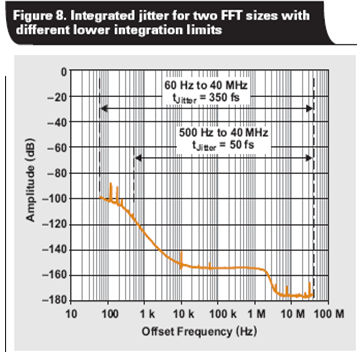 为了进一步描述该点,我们利用两个不同的FFT尺寸—131,072 和 1,048,576 点,使用 ADS54RF63 进行实验。采样速率设定为 122.88MSPS,而图 8 则显示了时钟相位噪声。我们将一个 6-MHz、宽带通滤波器添加到时钟输入,以限制影响抖动的宽带噪声数量。选择 1-GHz 输入信号的目的是确保 SNR 减弱仅由于时钟抖动。图 8 表明两个 FFT 尺寸的 1/2 容器尺寸到 40MHz 相位噪声整合抖动结果都极为不同,而“表 1”的 SNR 测量情况也反映这种现象。
