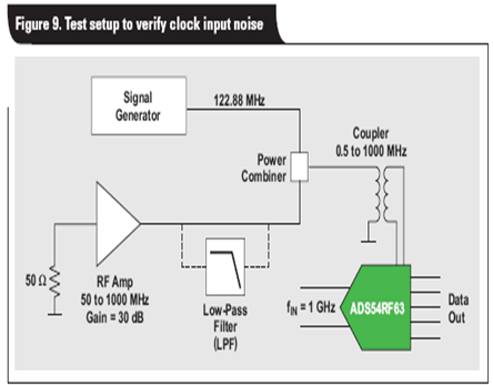 若想要验证时钟相位噪声是否需要整合至时钟输入带宽,则需建立另一个实验。ADS54RF63 再次工作在 122.88 MSPS,其输入信号为 1GHz,以确保 SNR 抖动得到控制。我们利用一个 RF 放大器,生成 50MHz 到 1GHz 的宽带白噪声,并将其添加至采样时钟,如图 9 所示。之后,我们使用几个不同低通滤波器 (LPF) 来限制添加至时钟信号的噪声量。