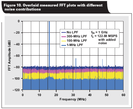 该实验表明,时钟相位噪声必需非常低或者带宽有限,较为理想的情况是通过一个很窄的带通滤波器。否则,由系统时钟带宽设定的整合上限会极大降低 ADC 的 SNR。
