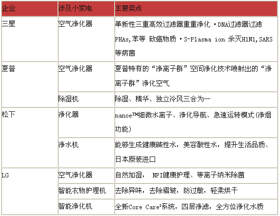 除LG外,松下、夏普、三星等外资企业均在持续推出小家电产品,主要涉及空气净化器和净水机两大产品线,其中空气净化器是涉足比较多的一类产品。
