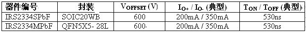 IRS2334SPbF 采用 SOIC20WB 封装,而 IRS2334MPbF 则以 QFN5X5 封装供货,占位面积只有25 mm2 ,并按照合适的爬电与间隙距离要求来设计,确保产品坚固可靠,电压可高达600V。