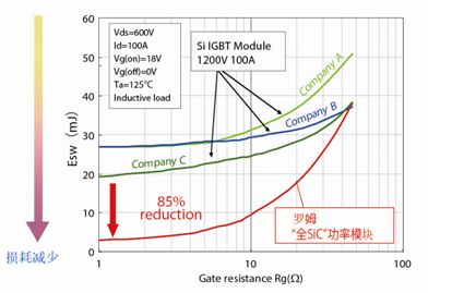 内置了最先进的SiC-SBD与SiC-MOSFET的“全SiC”模块,与传统的Si-IGBT相比,开关损耗可降低85%。