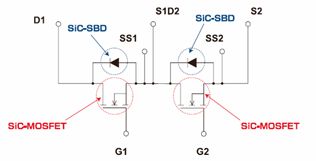 内置最先进的SiC-SBD和SiC-MOSFET两种元件,与传统的Si-IGBT模块相比,可以将电力转换时的损耗降低85%。另外,与IGBT模块相比,在10倍于其的频率-100kHz以上的高频环境下工作成为可能。该产品的额定电流为100A,通过高速开关和低损耗化,可以与额定电流为200~400A的Si-IGBT??榻刑婊?。